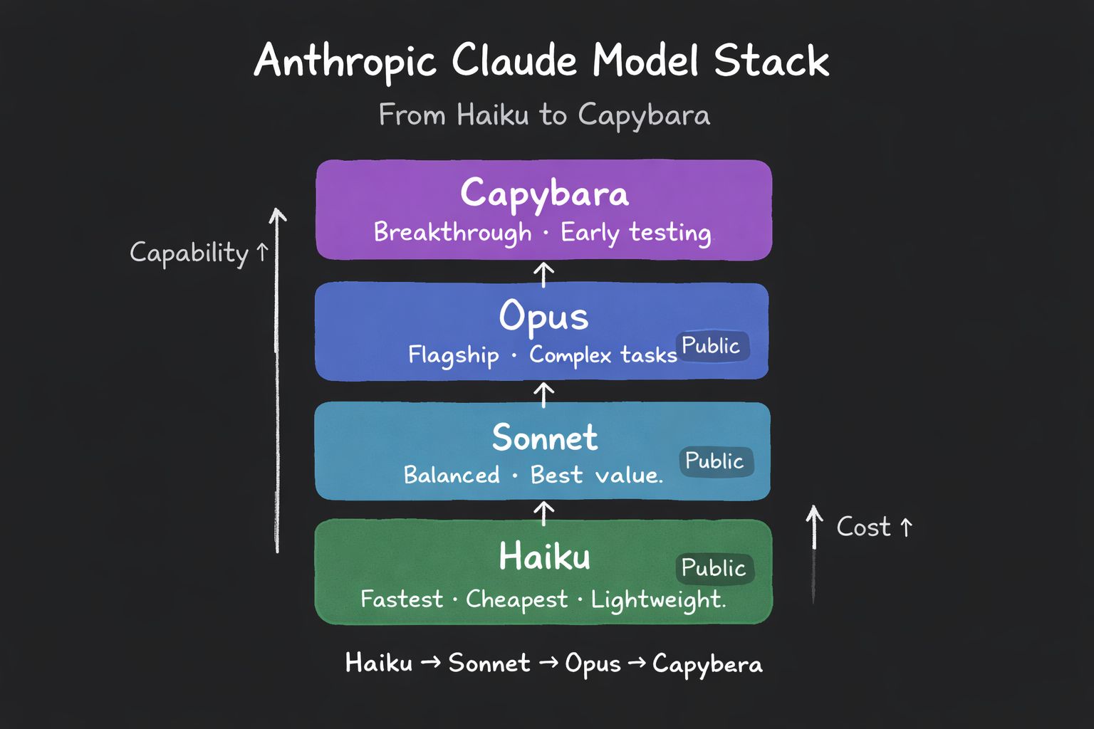 First, the model hierarchy. Right now, Anthropic has three tiers: Haiku (fast and cheap), Sonnet (balanced), and Opus (most capable).