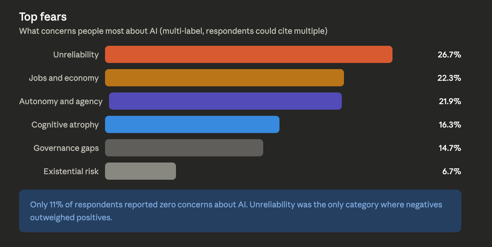 Job displacement and economic impact came second at 22.3%. Loss of human autonomy and agency was right behind at 21.9%. Cognitive atrophy (the fear that relying on AI is making us worse at thinking) hit 16.3%. And concerns about governance gaps rounded out the top five at 14.7%.